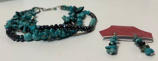 Handmade Multi-Strand Turquoise Chip & Black Faceted Bead Necklace Set with Matching Earrings – Boho Statement Jewelry