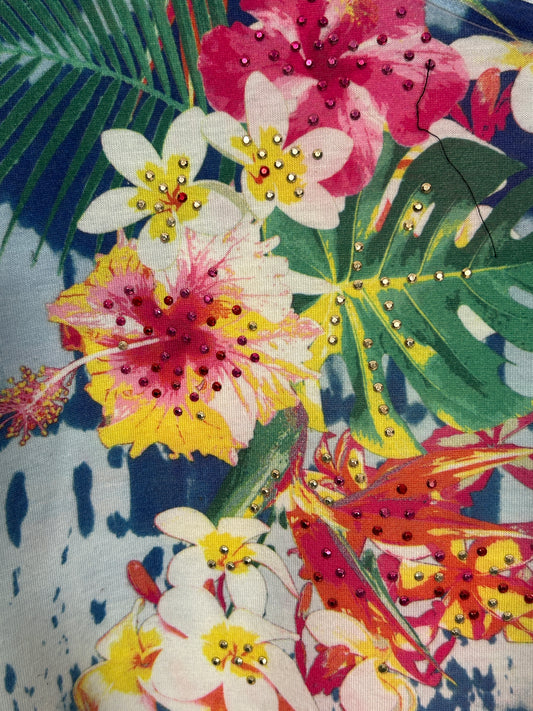 Joei & i Women's Tropical Floral Tie-Dye Rhinestone Embellished T-Shirt Top - Size Large