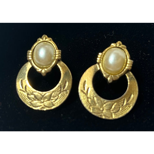Vintage Gold Tone Floral Hoop Earrings with Pearl Center 1"