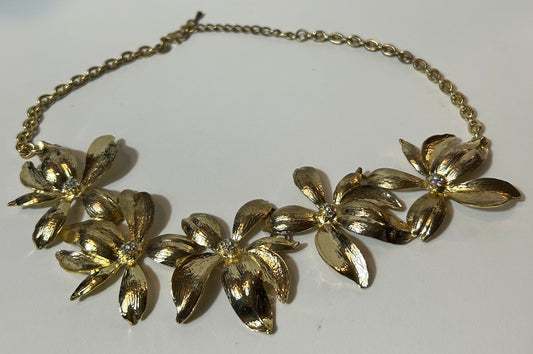Vintage Gold-Tone Floral Statement Necklace with Textured Petals and Rhinestone Centers