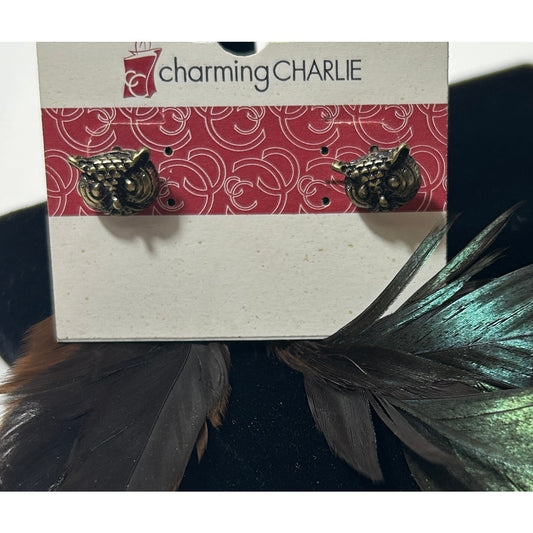 Charming Charlie Owl Stud Earrings with Long Iridescent Feather Dangles