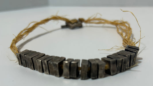 Rustic Artisan Necklace with Textured Metal Beads on Natural Raffia Cord – Statement Tribal Boho Jewelry