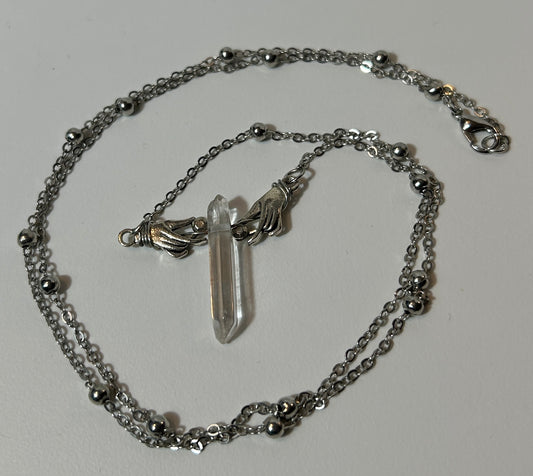 Boho Gothic Quartz Crystal Necklace with Silver Hand Clasp and Ball Bead Chain