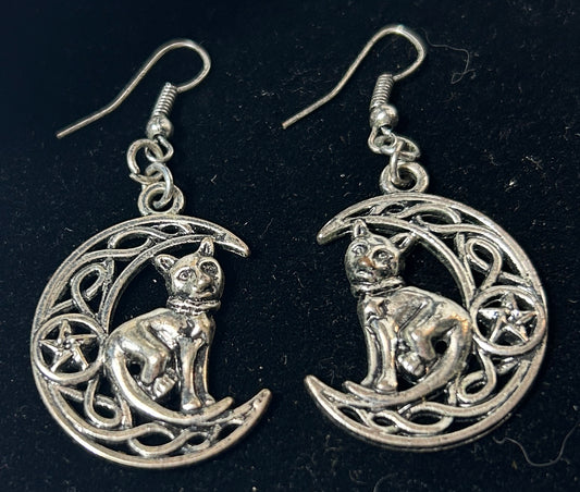 Witchy Silver Cat on Crescent Moon Earrings with Pentacle – Pagan Wiccan Jewelry