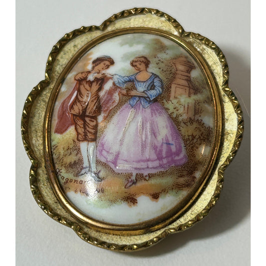 Vintage Limoges Porcelain Brooch Pendant Signed Fragonard Gold Tone