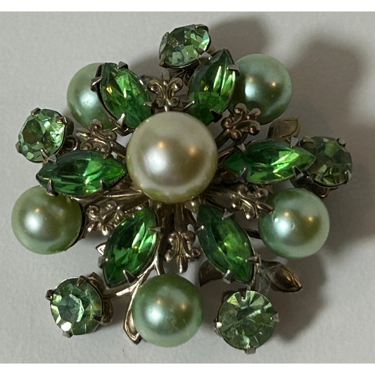 Vintage Green Rhinestone Faux Pearl Floral Brooch Pin 1.5"