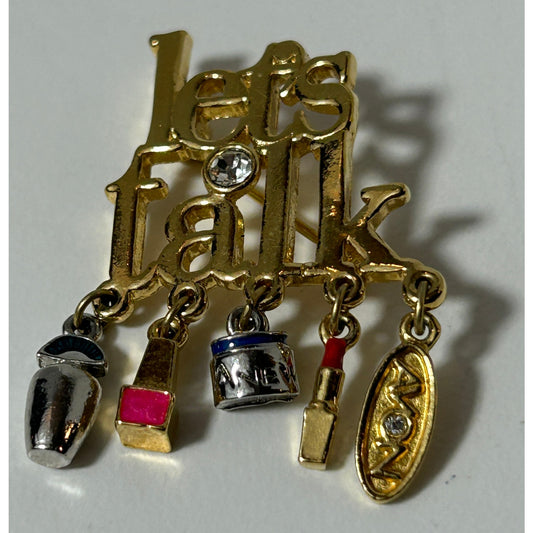 Vintage Avon "Let's Talk" Gold Tone Brooch with Makeup Charms, Rhinestone Accent