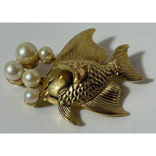 Vintage Gold Tone Fish Brooch with Faux Pearl Bubbles 1.75″ Statement Pin