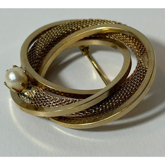 Vintage Gold Tone Mesh Swirl Brooch with Faux Pearl 1.75" Statement Pin
