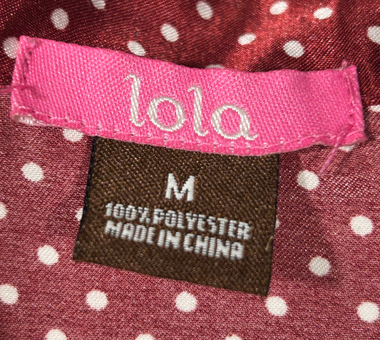 Vintage Burgundy Satin Polka Dot Blouse – Lola | Size M | Short Puff Sleeve Button-Up with Tie Waist