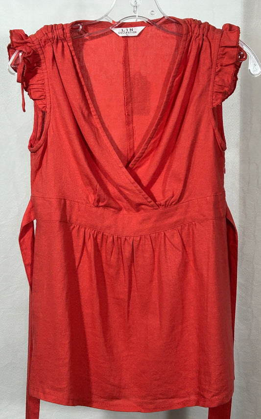 Vintage LIN Collection Red Hemp/Cotton Blend Sleeveless Wrap Blouse – Ruffled Shoulder Detail, Size L