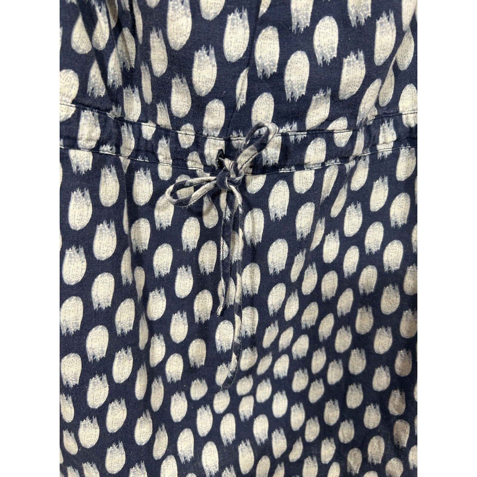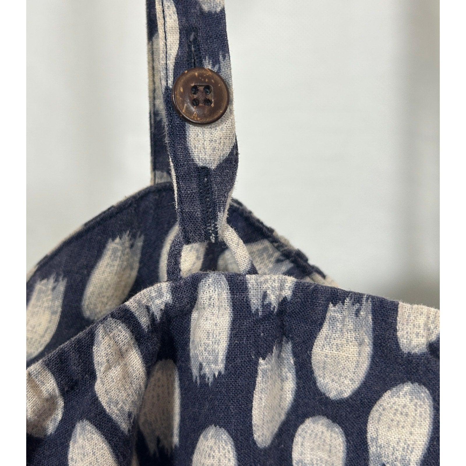 This Patagonia women’s size 12 tank top is crafted from a sustainable 55% hemp and 45% organic cotton blend, making it both eco-friendly and stylish. It features an eye-catching navy and cream polka dot pattern, adjustable button straps, and a drawstring waist for a flattering fit. The lightweight, breathable fabric is perfect for warm weather, casual outings, or layering under a cardigan.