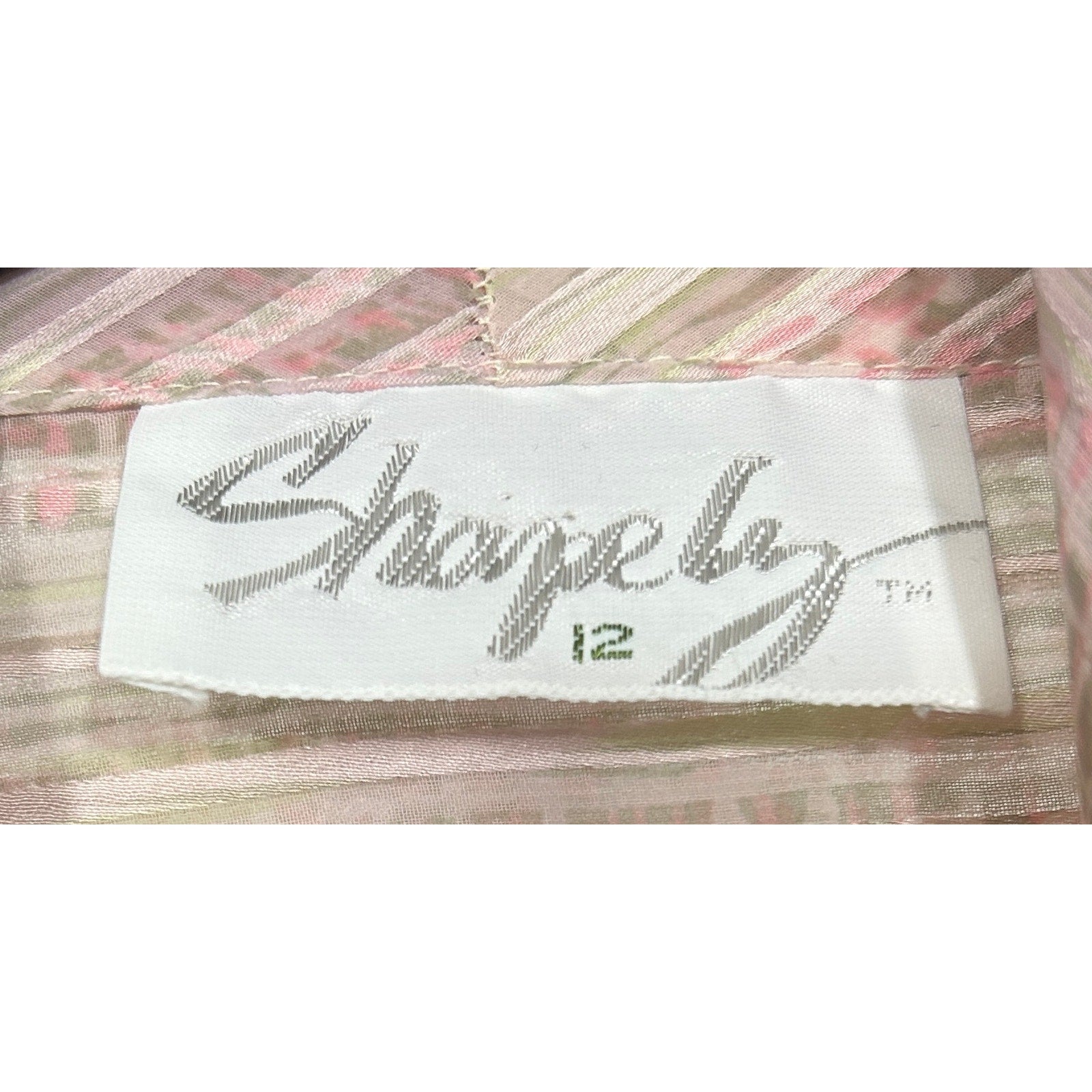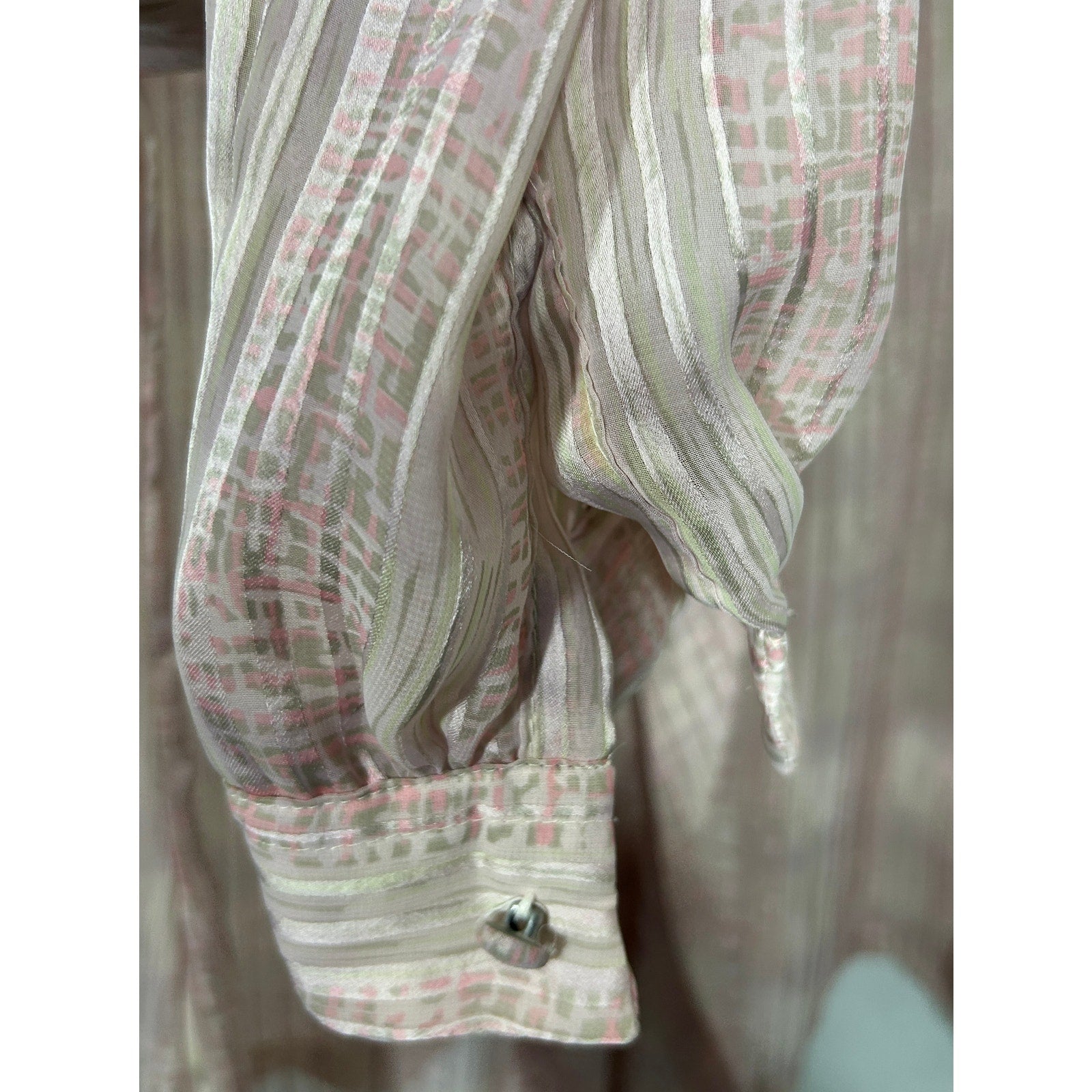 This vintage sheer blouse by Shapely features a soft pink and taupe striped pattern with subtle texturing and an elegant pussy bow neckline. The delicate fabric drapes beautifully and includes fabric-covered buttons and structured cuffs with button closures. Light shoulder pleating adds a gentle puff to the sleeve, giving it a romantic silhouette perfect for layering or wearing on its own.
